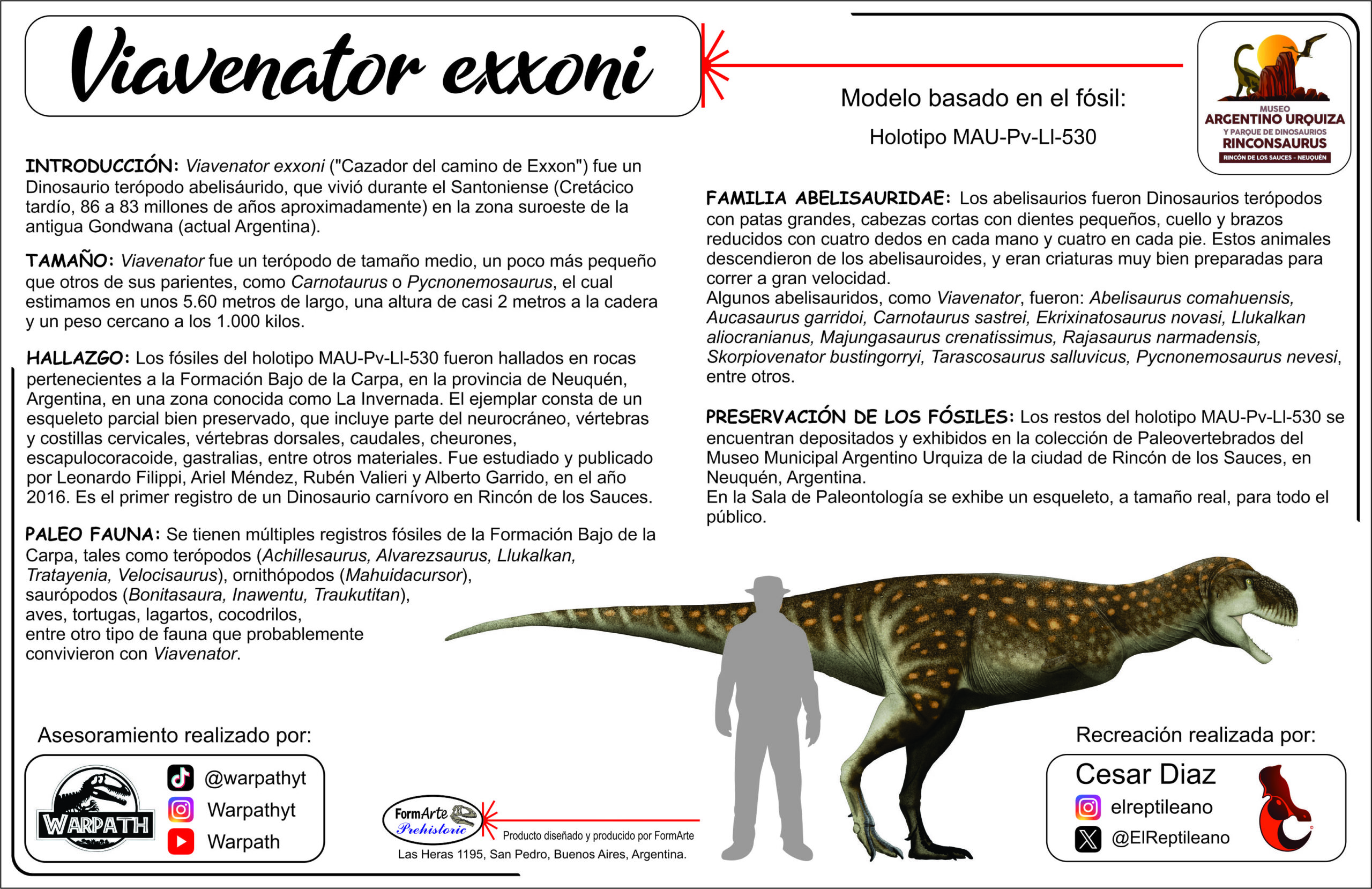 Cada modelo tiene incluidos carteles indicativos con el nombre y datos técnicos del espécimen y una silueta humana a escala para poder apreciar el tamaño del fósil.